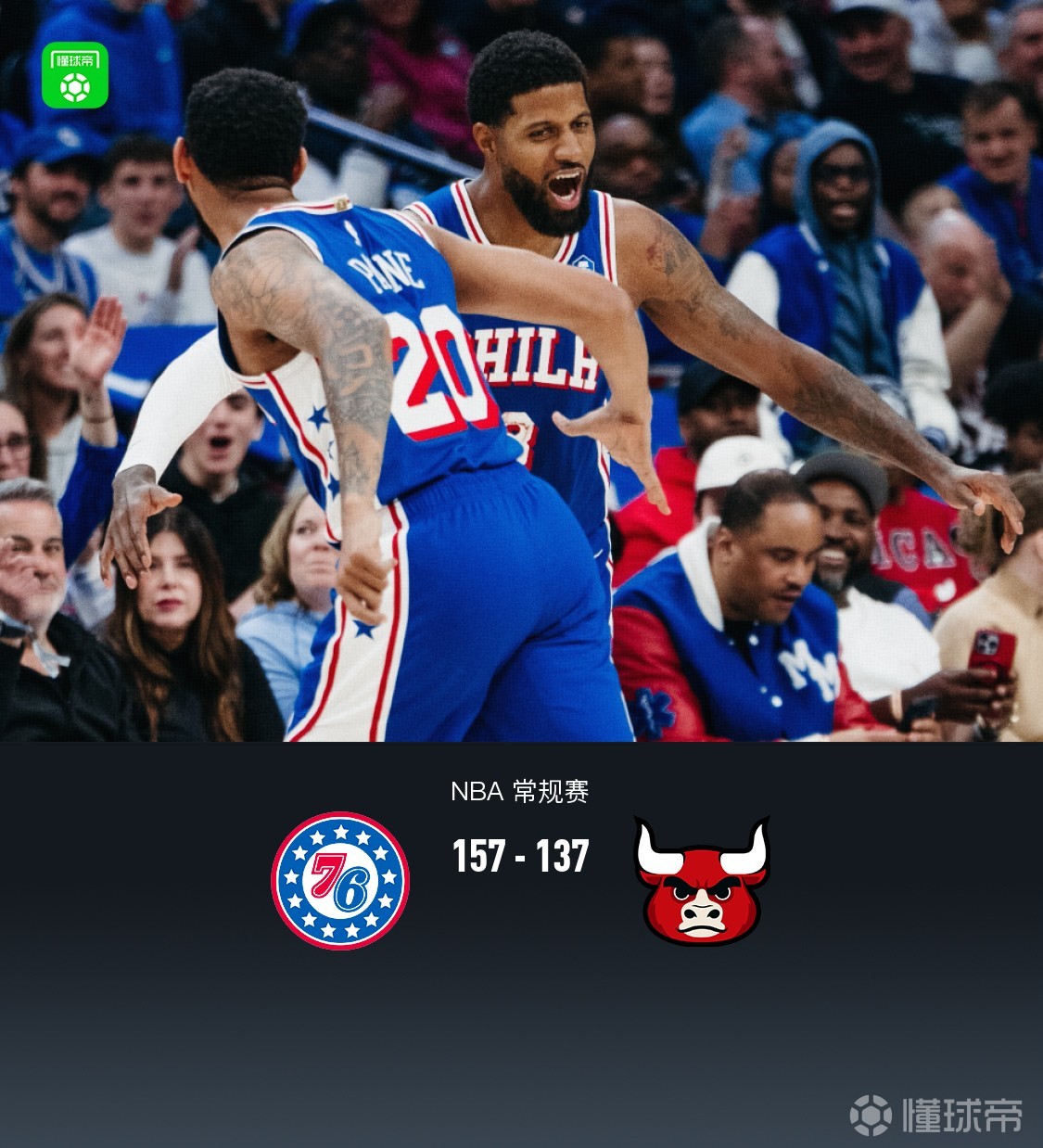 第四節(jié)76人保羅-喬治拿下13分,公牛倫納德-米勒拿下12分,最終76人157-137戰(zhàn)勝公牛