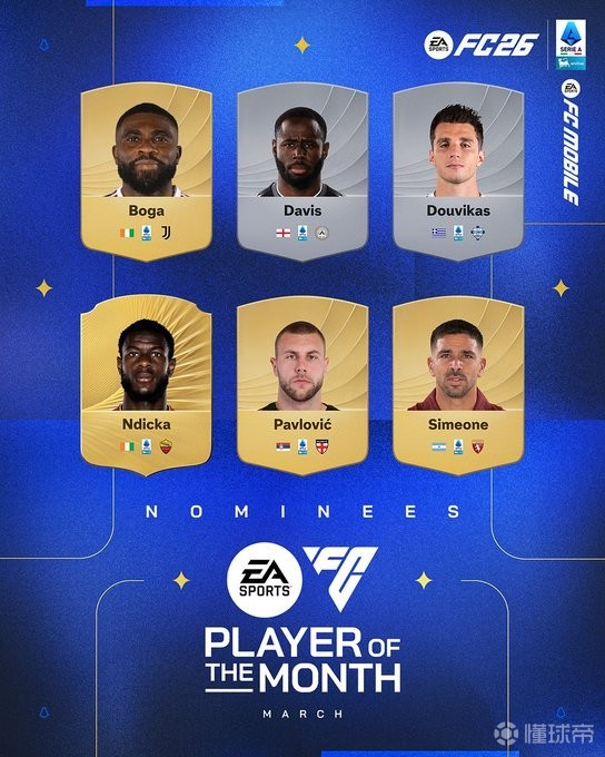 北京時(shí)間3月26日,意甲3月最佳球員候選名單公布,這6名球員為博加、凱南-戴維斯、杜維卡斯、恩迪卡、帕夫洛維奇、喬瓦尼-西蒙尼。